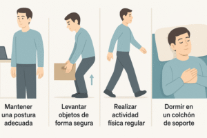 - Cambios en el estilo de vida: Corregir la postura al sentarse y trabajar, Hacer pausas activas durante el día y Mantener un peso saludable.